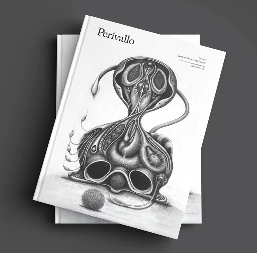 This 92-page illustrated volume pairs speculative fiction with atmospheric graphite plates by writer and artist Neil Powell, whose detailed renderings give form to Perívallo’s living geology, alien architecture, and vast biological continuity.